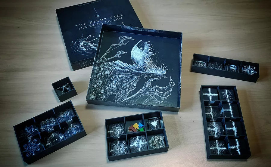 The Shrieking Hollow is an expansion that adds a new threat and a new space to explore within The Night Cage. Pits now connect prisoners to the Hollow, where The Other lies in wait. Over the course of play, The Other will rise up out of the Hollow and attack the prisoners, destroying any part of the maze it encounters. If the prisoners are brave, they can leap into a pit and fall to the bottom of the Hollow where the dim light of their candles will stop its advance, temporarily. However, they can't hold it back forever, and prisoners that stay too close to The Other will be attacked when it lurches toward the flickering light it despises.