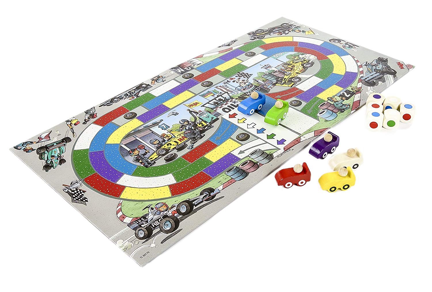 Six racing cars are standing on the starting grid, of the 3 lane racing board. But only the player who gets the right colors with the dice and makes clever combinations will be able to move rapidly ahead.