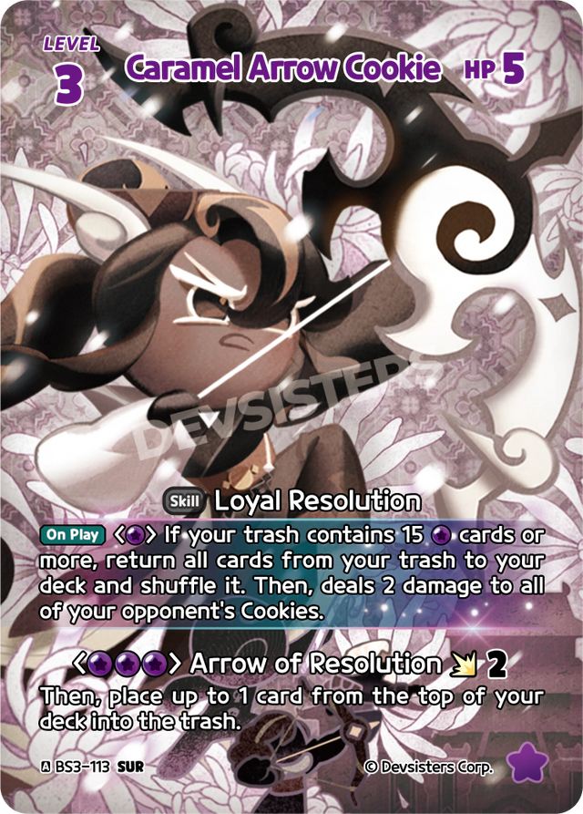 【On Play】 <{P}> If your trash contains 15 {P} cards or more, return all cards from your trash to your deck and shuffle it. Then, deals 2 damage to all of your opponent's Cookies.