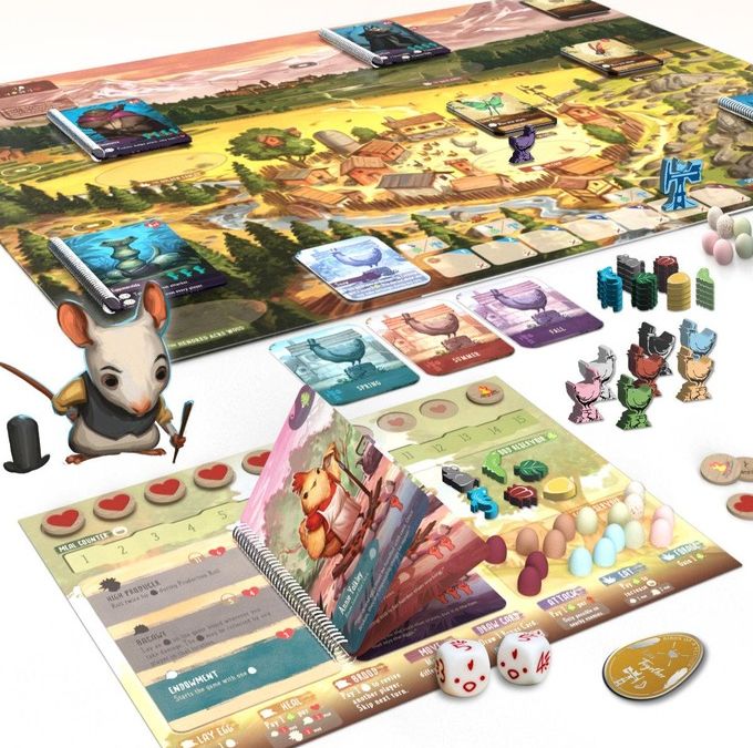 Every turn, players choose their own strategy to progress their cause by selecting two of their eight available actions. Along the way, players will also have to manage leveling up, predator loot drops, traveling grubs, and adverse weather conditions. However, players must plan carefully, because as the seasons change, every predator that is still alive grows stronger and gains new abilities.