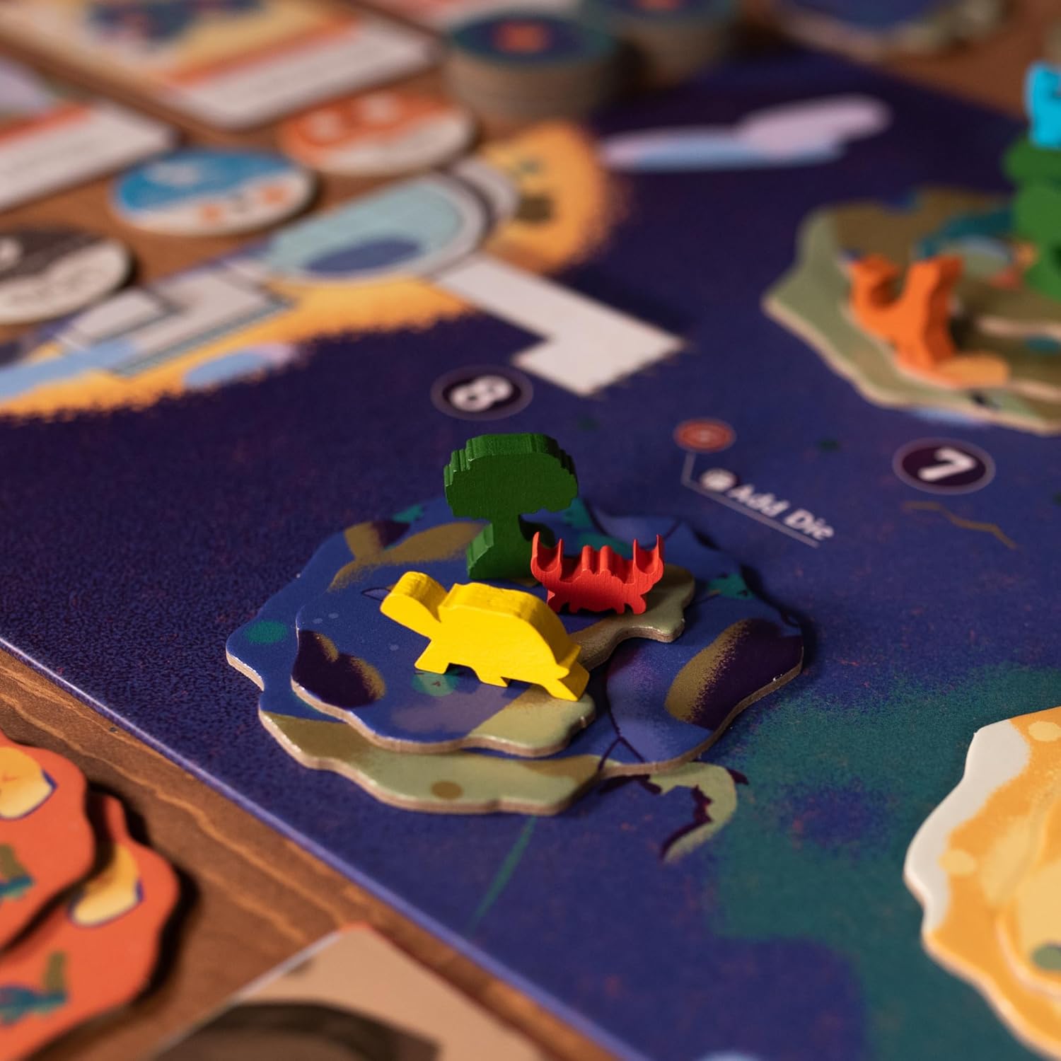 New islands have emerged from the ocean and as scientists, you must research the new, developing ecosystems present there! Watch the islands on the board grow in three dimensions as you learn more about them, and add colorful plants and animals to each island as you explore their ecosystems. Each round, earn points by rolling your dice and using them to collect research and make discoveries. All players start with the same research board, however throughout the game you’ll be able to modify your own board and change what you’re researching. After 8 rounds, score points based on how flourished and bio-diverse your islands are and varying research objectives.
