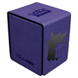 The Alcove Flip Box for Pokémon features a debossed image of Gengar on a leatherette finish with premium foil detailing. A strong magnetic closure keeps your cards safely secured inside, and dual thumb notches offer easy access to your deck. This Deck Box holds up to 100+ standard size trading cards double sleeved in Ultra PRO Deck Protector sleeves. The lid can be detached from either side of the box to accommodate any play style.