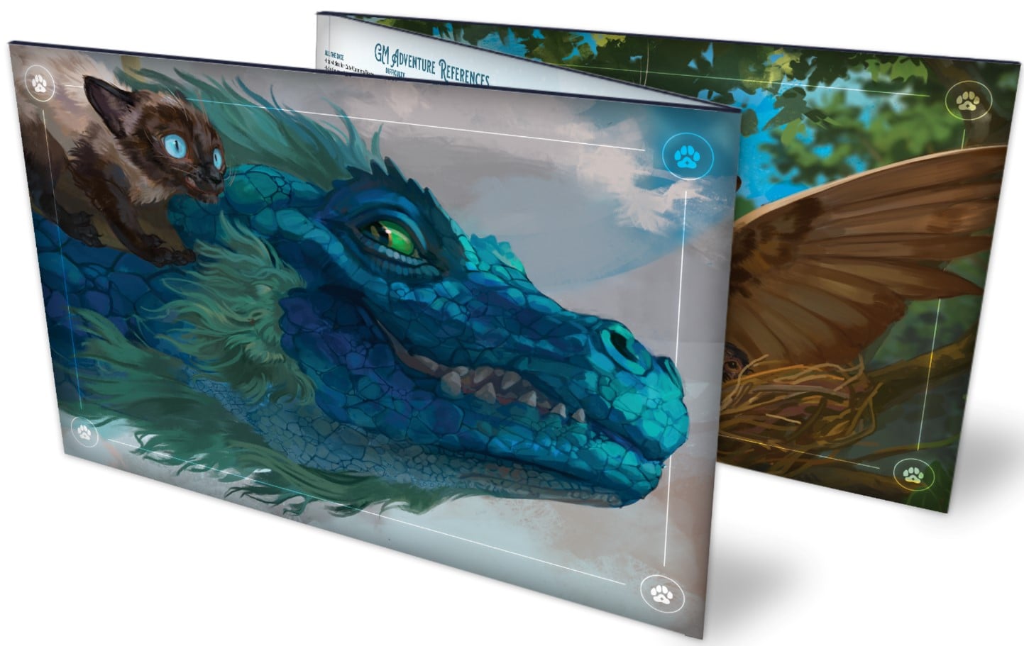 This GM screen is purrfectly proportioned for even the youngest GM. The screen's 3 horizontal panels each measure 6x9 inches. That's smaller than other screens, to make it easy for your kid-GM to see the players at the table. The Game Master-facing side provides important information at a glance, and Magical Kitties artwork on the outside sets the atmosphere for your game.