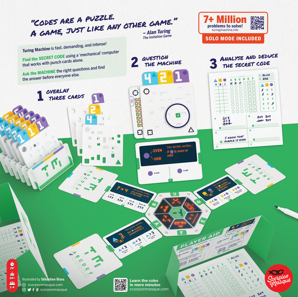 The Goal? Find the secret code before the other players, by cleverly questioning the machine. With Turing Machine, you’ll use an analog computer with unique components made of never-before-seen perforated cards.