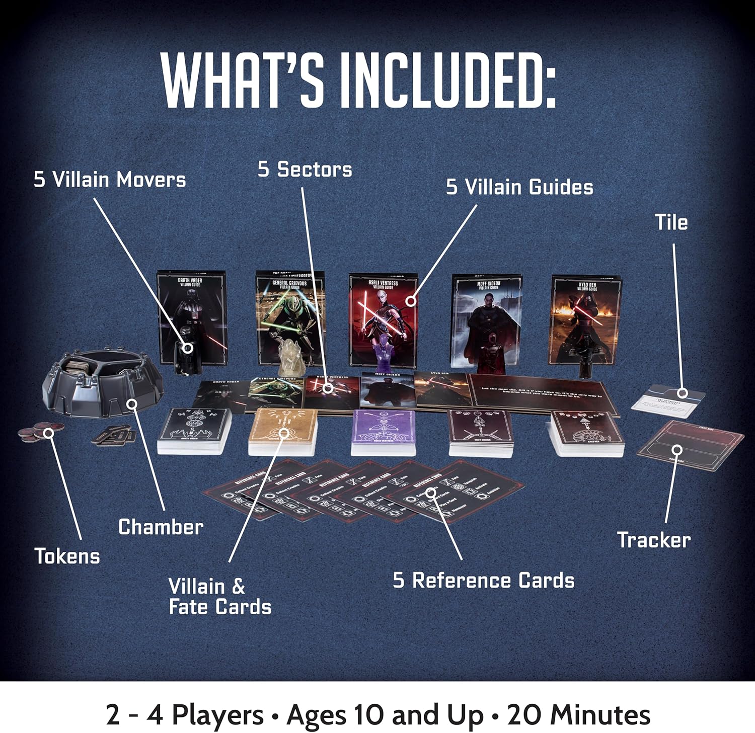 Unleash your inner villain in Star Wars - Power of The Dark Side. Choose to play as the mysterious Darth Vader, cunning Kylo Ren, or the devious General Grievous, Asajj Ventress, or Moff Gideon, each with distinct abilities and goals to achieve. Navigate the twists of fate as you encounter iconic Jedi and heroes like Luke Skywalker, Princess Leia, and the Mandalorian, who will challenge your sinister plans. Deploy iconic TIE Fighters, engage with the Millennium Falcon, and use Ambition to power your Villain’s unique abilities. Utilize the included villain guides to master each character's unique strategies for endless replayability. Power of The Dark Side is suitable for kids ages 10 and up, with a playing time of about 20 minutes per player.
