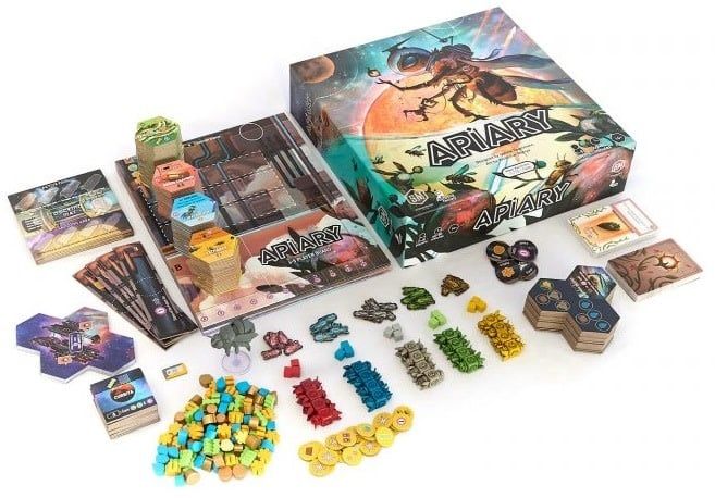 In Apiary, each player controls 1 of 20 unique factions. Your faction starts the game with a hive, a few resources, and worker bees. A worker-placement, hivebuilding challenge awaits you: explore planets, gather resources, develop technologies, and create carvings to demonstrate your faction’s strengths (measured in victory points) over one year’s Flow. However, the Dearth quickly approaches, and your workers can only take a few actions–with benefits increasing relative to worker strength, culminating in powerful strength-4 bonuses–before they must hibernate!