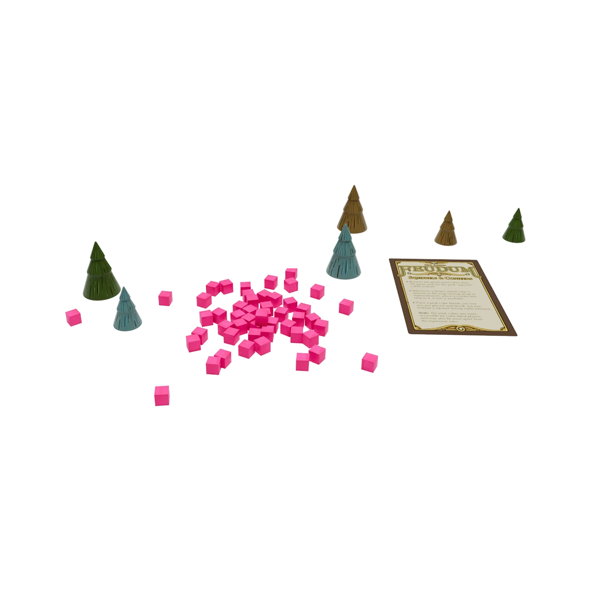 Feudum: Squirrels and Conifers is a beautiful "mini-expansion" featuring 50 tasty squirrels and 6 wooden conifer trees that bring the board's topography to life! This expansion replaces the green food cubes with pink ones and creates a multiplying food source on the map. The expansion also enhances accessibility for the majority of color blind players. BOX NOT INCLUDED