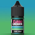 Twin Suns is a rock/jazz/blue-green fusion — when used over white it is light blue with green and gold highlights, used over black it is green with blue and gold. It is blue in the bottle.