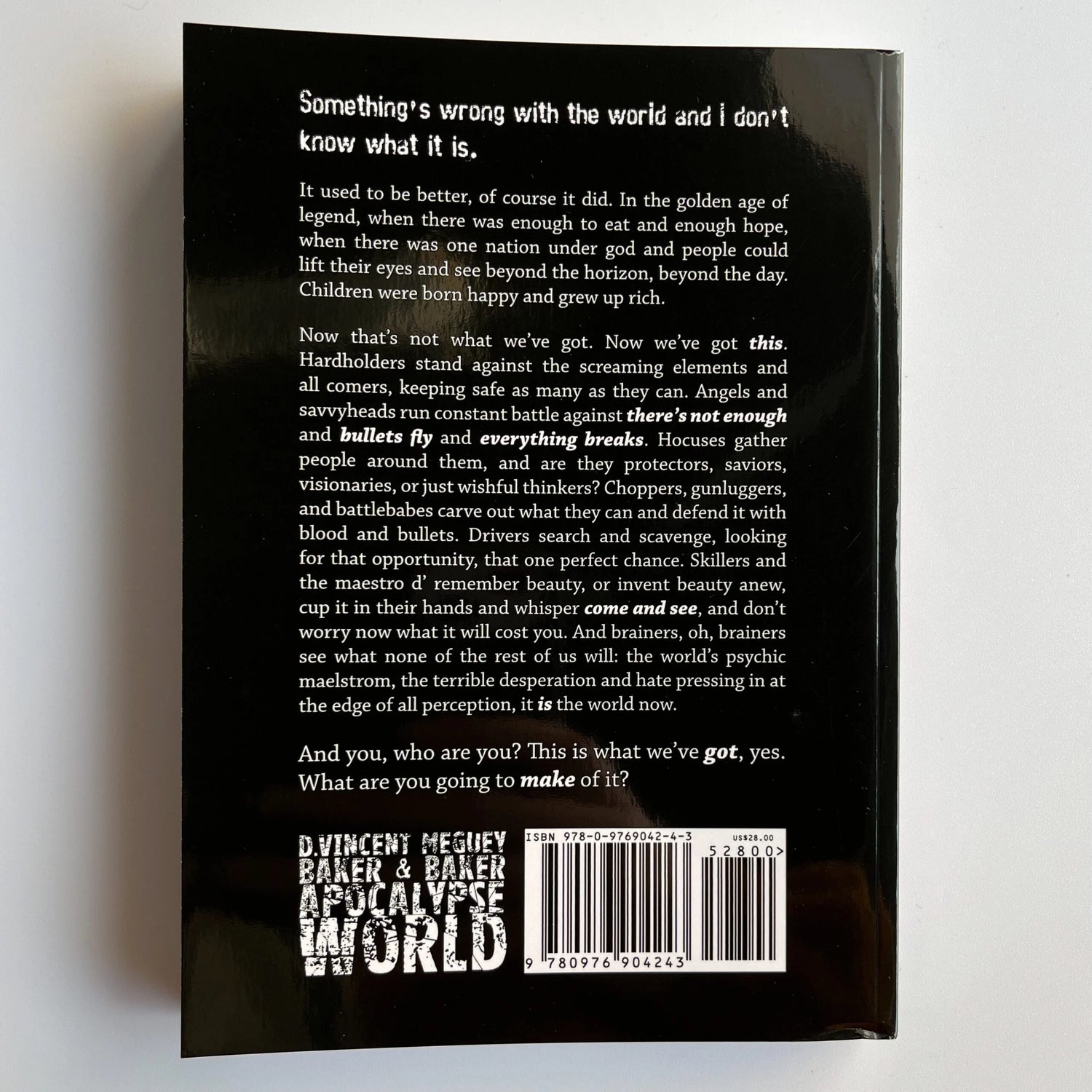 There are no preplanned adventures or settings for Apocalypse World. Instead there are clear agendas and principles to build our own apocalypse and play to find out what happens. The apocalypse is here; visionaries and protectors, battles and bullets, and the world’s psychic maelstrom pressing in at the edge of perception. What are you going to make of what’s left of the world?
