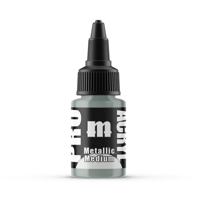 Metallic Medium is a special blend of pigment and metal flake that not only gives you the brightest "white metal" for painting highlights and such, but also a great base medium for adding other color to for creating your own metallic colors. We recommend using our Transparent line of colors to get super vibrant metallic colors quickly and without reducing the shine of the metallic paint.