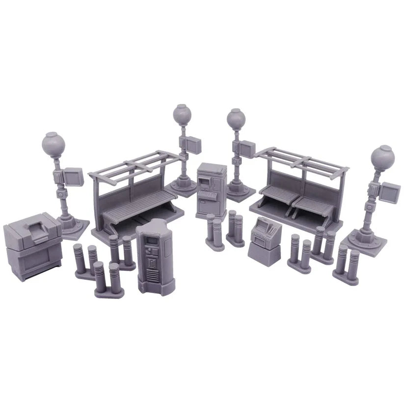 The City Streets set includes 4 street lights, 2 bus stops with movable benches, 8 protective bollards, 1 drop box, and 3 terminals. The terminals make great objectives and can serve as public data terminals, modern ATMs, or sci-fi access points.
