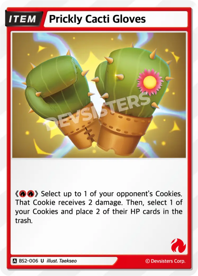 Effect- <{R}{R}> Select up to 1 of your opponent's Cookies. That Cookie receives 2 damage. Then, select 1 of your Cookies and place 2 of their HP cards in the trash.