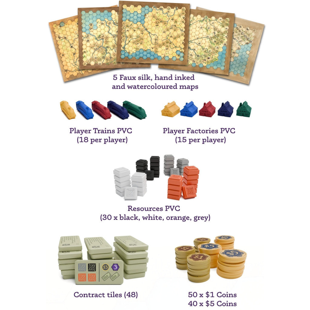 On your turn, you can perform two actions from several choices, allowing you to lay tracks, build factories, fulfill contracts, earn money, or obtain more contracts. Building a factory brings resources to the board that all players can access... but at a certain price.