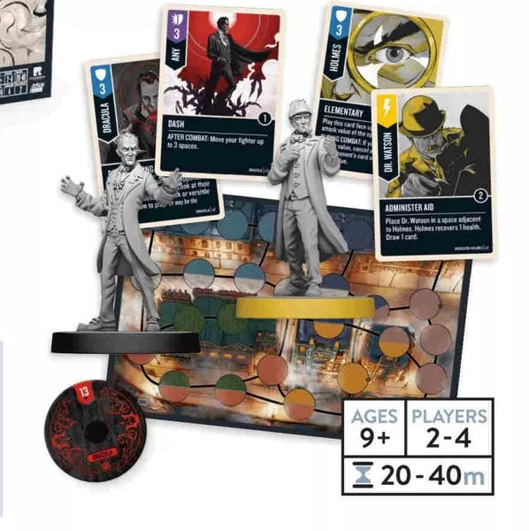 Unmatched: Cobble & Fog features four new heroes for the Unmatched system. Invisible Man uses fog to dart around the board and strike without warning. Sherlock, with the trusty Watson by his side, schemes and calculates to ensure victory. Dracula and the sisters slowly drain you of your power. Jekyll & Hyde uses the former's cunning and the latter's brute strength to win the day.