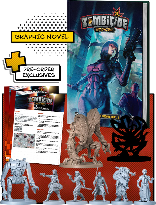Zombicide: Invader - Playing Prometheus And the associated pre-order exclusive content: 5 Survivors, 2 Abominations, 1 A.P.E. 002 Serv Bot, 5 ID Cards, 12 Spawn Cards, 1 Equipment Card, and 2 Missions.